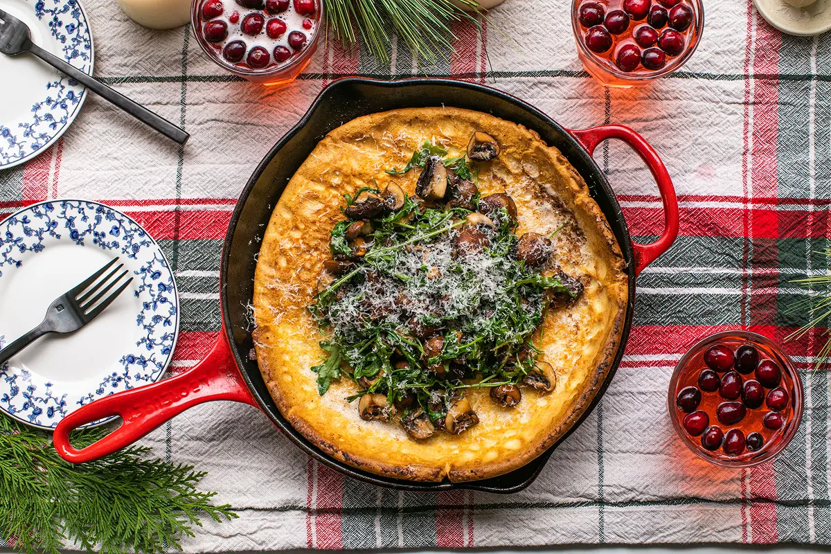 Spoon the warm mushroom–arugula mixture into the center of the hot Dutch baby.